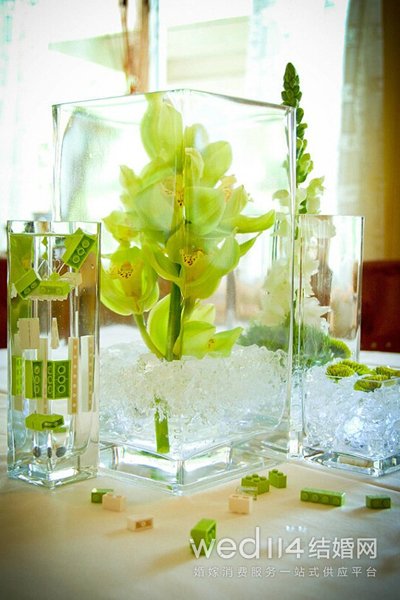桌花当然不能忽视,拿一杯清水,放入和桌花颜色对应的乐高积木,你的婚礼就是这样创意无限,让人难忘。