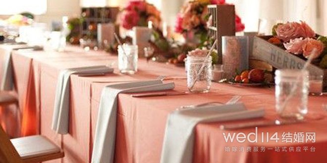 正方形和长方形的餐桌,选择用的桌布搭配婚礼主色即可,直接平铺在餐桌上,四角垂下的桌布成自然褶皱,宾客的双脚在桌子下也有足够的活动空间。若果新人觉得平铺的桌布没有新意,可以选择错落重叠的正方形桌布,能带来丰富的层次感,增添视觉效果。如果是颜色搭配的桌布,新人在布置时要深思熟虑,以免过多的颜色让人感觉繁复厚重。有装饰图案的桌布也十分受宾客或是新人的青睐,特别是按照婚礼风格和主题色彩定做的桌布。